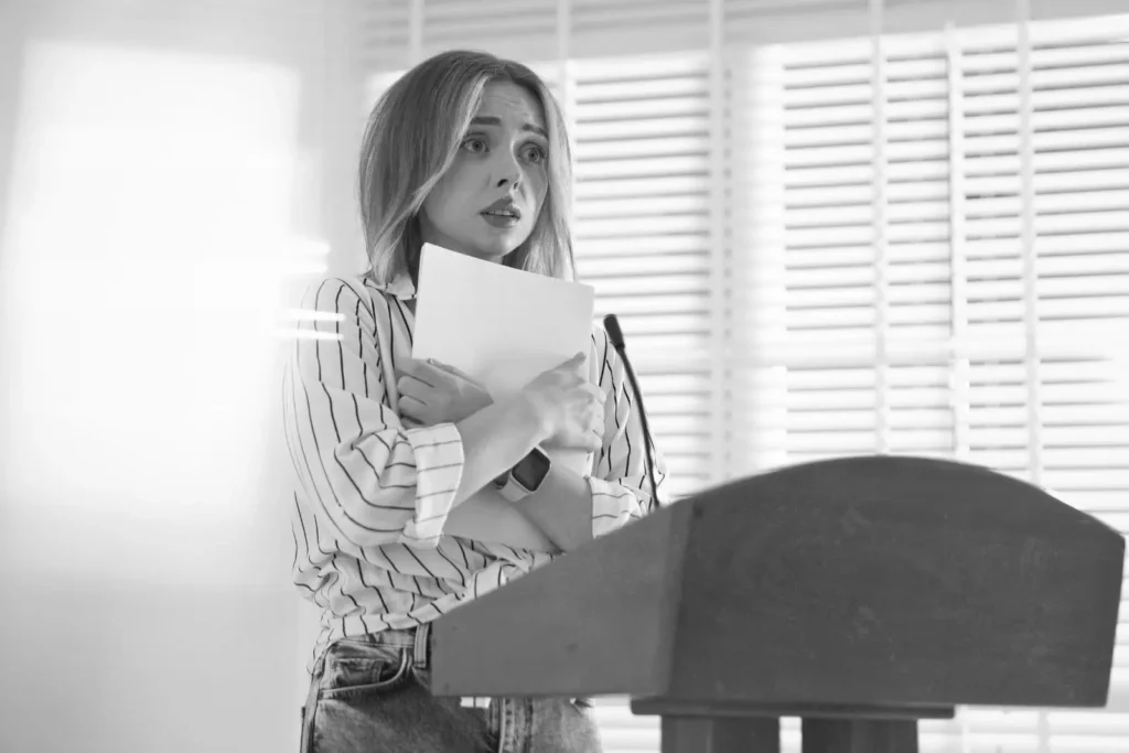 Public speaking anxiety is common. Even people who look confident can feel their body flip into panic: dry mouth, shaky voice, racing thoughts, blank mind, heart pounding.